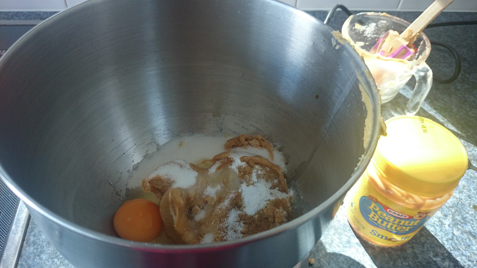 Besides dark chocolate, what tastes great with a coffee? For me, it is a big tasty cookie that is crunchy on the outside and chewy in the center. The recipe below is excellent and came out of a need to get some food into my sick daughter, who likes peanut butter, while at the same time trying to find something flourless as I am trying to eat less wheat. I was also excited to make it as I don't think Ive ever had a peanut butter cookie in Australia. Peanut butter in not popular here; it is a very American food. Most people would have a vegemite or butter and honey sandwich before they'd have a peanut butter and jelly sandwich. These cookies are great! I made flourless cakes before but never flourless cookies. The batter texture is different and at one point I thought it was all wrong and was going to toss it. Don't that! It may seem weird and different, but they are delicious, especially if you like peanut butter and the combination of peanut butter and chocolate.